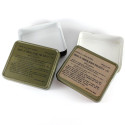 Boîte en aluminium peinte kaki/vert armée avec mode d'emploi imprimé ou collé recto-verso (pas de choix possible)