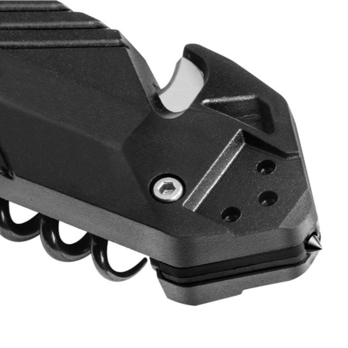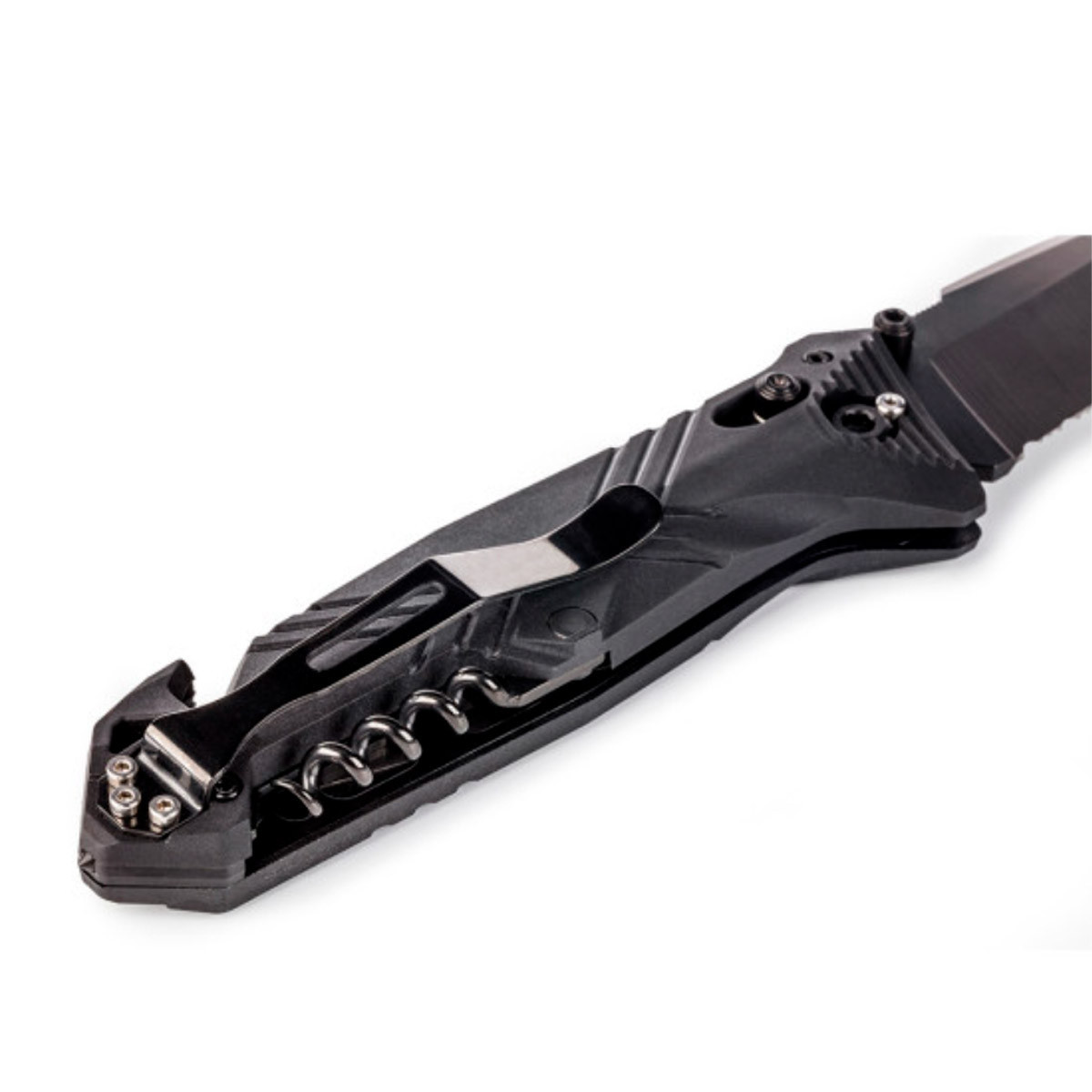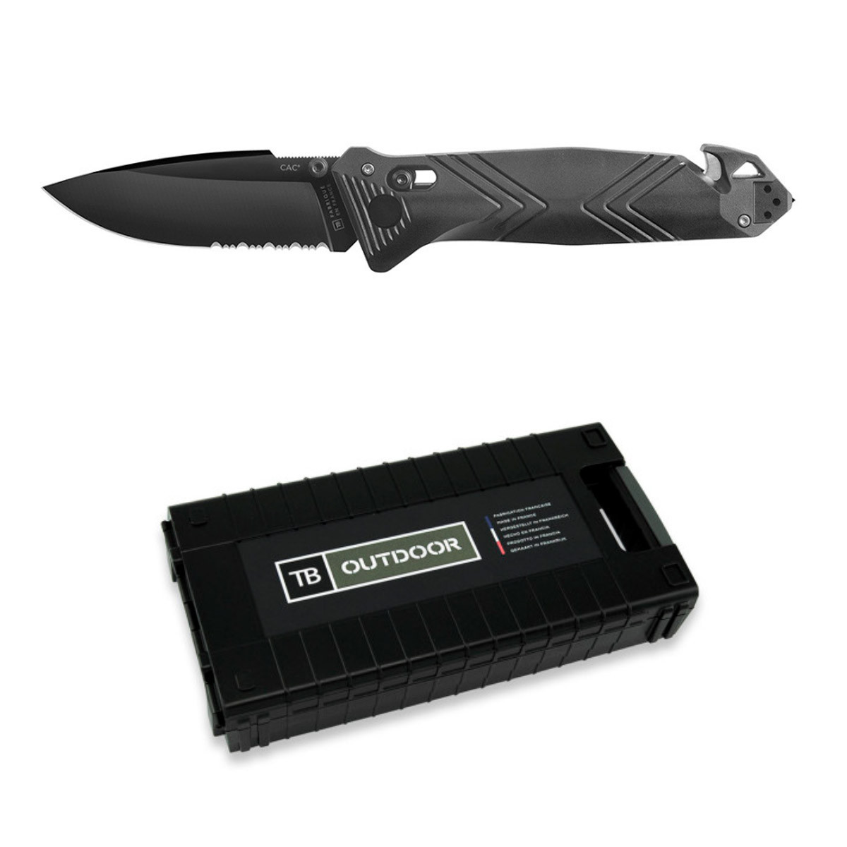 Avec sa lame mixte (lisse + serration) et son coupe-sangle, il se distingue du couteau Cac S200 par son manche chevron et son tire-bouchon.