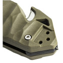 Le manche est constitué de deux plaquettes en polymère chargé de fibres de verre. Ces plaquettes sont vissées à la mécanique par des vis en acier inoxydable dont l'une d'elle loge astucieusement une lame coupe sangle. Cette lame courbe et interchangeable est conçue pour couper des sangles, des cordes et des ceintures de sécurité pour favoriser l'extraction en cas d'accident.