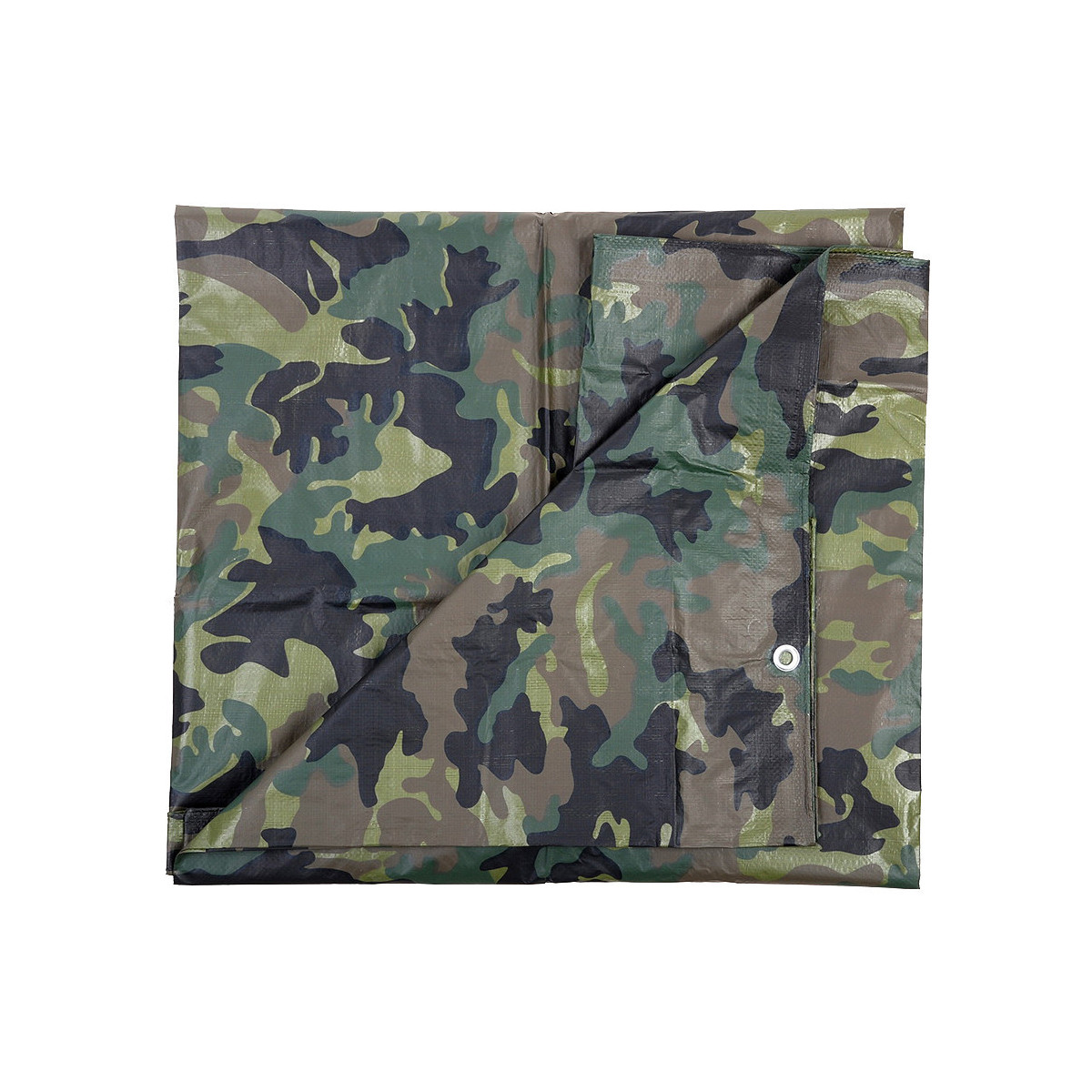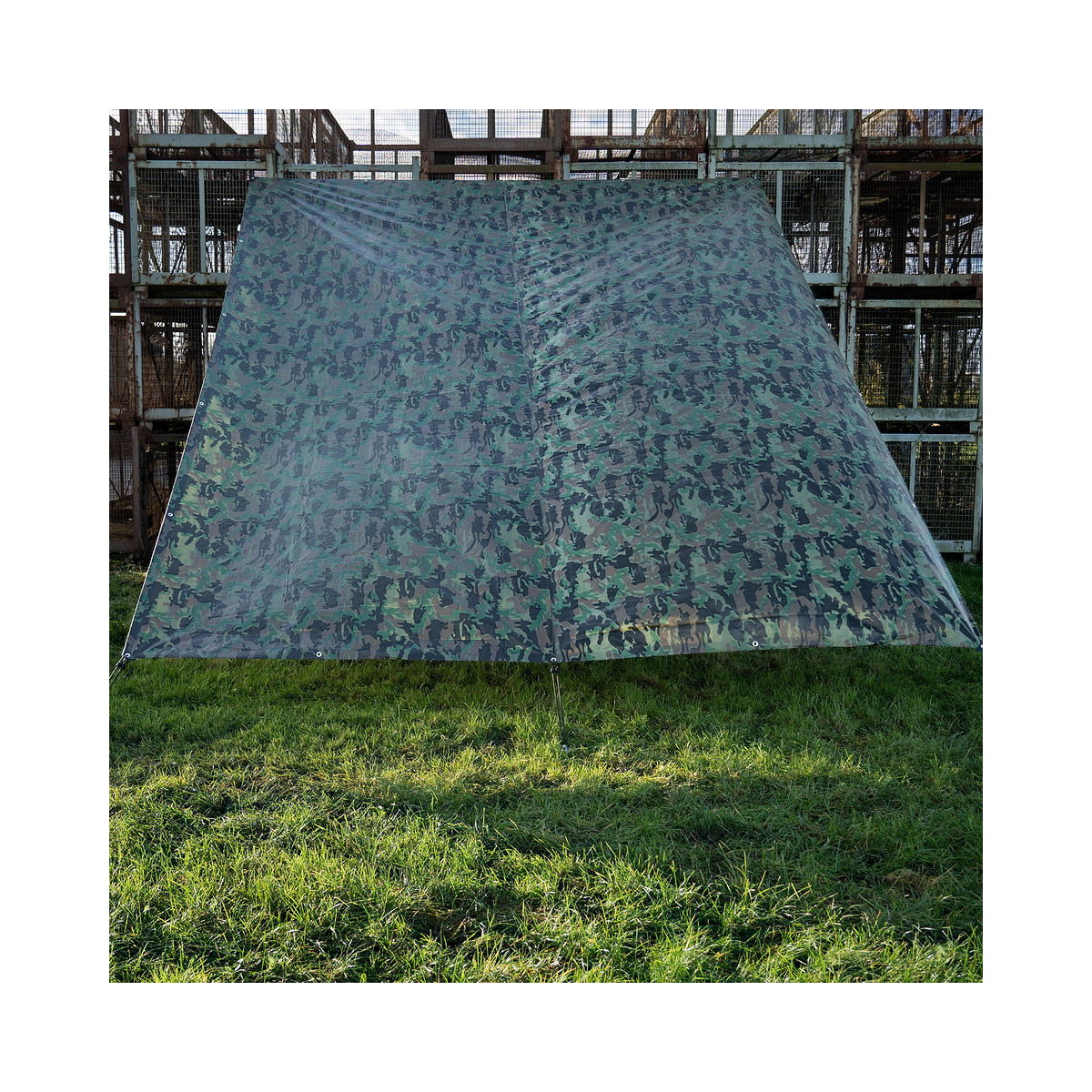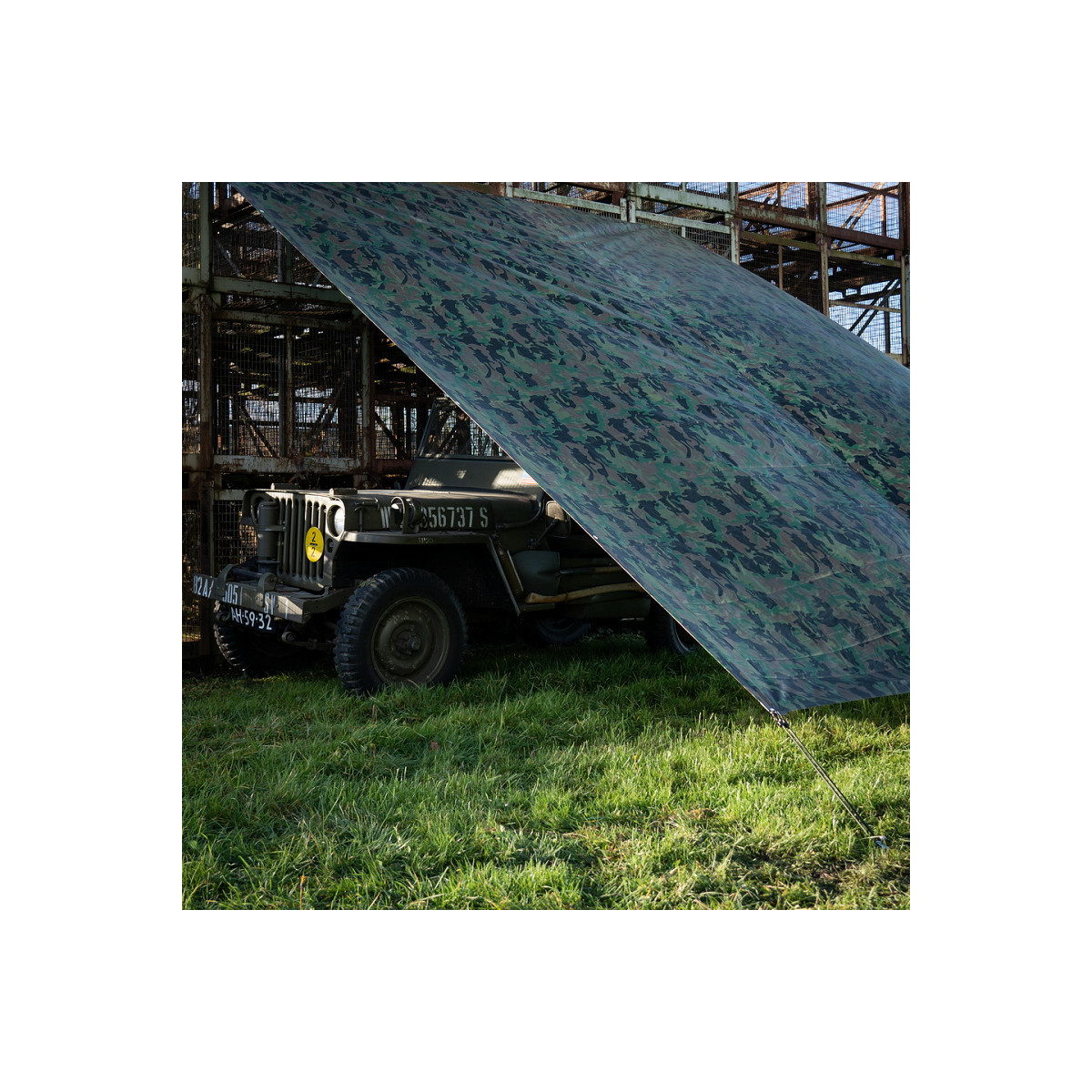 Tarp polyvalent et imperméable, 100 % polyéthylène. Parfait pour diverses activités de plein air telles que le paintball, la survie, le camping et comme couverture dans votre jardin. Les couleurs naturelles se fondent parfaitement dans la forêt et la nature, ce qui en fait une décoration extérieure idéale. Protège vos stères de bois efficacement.