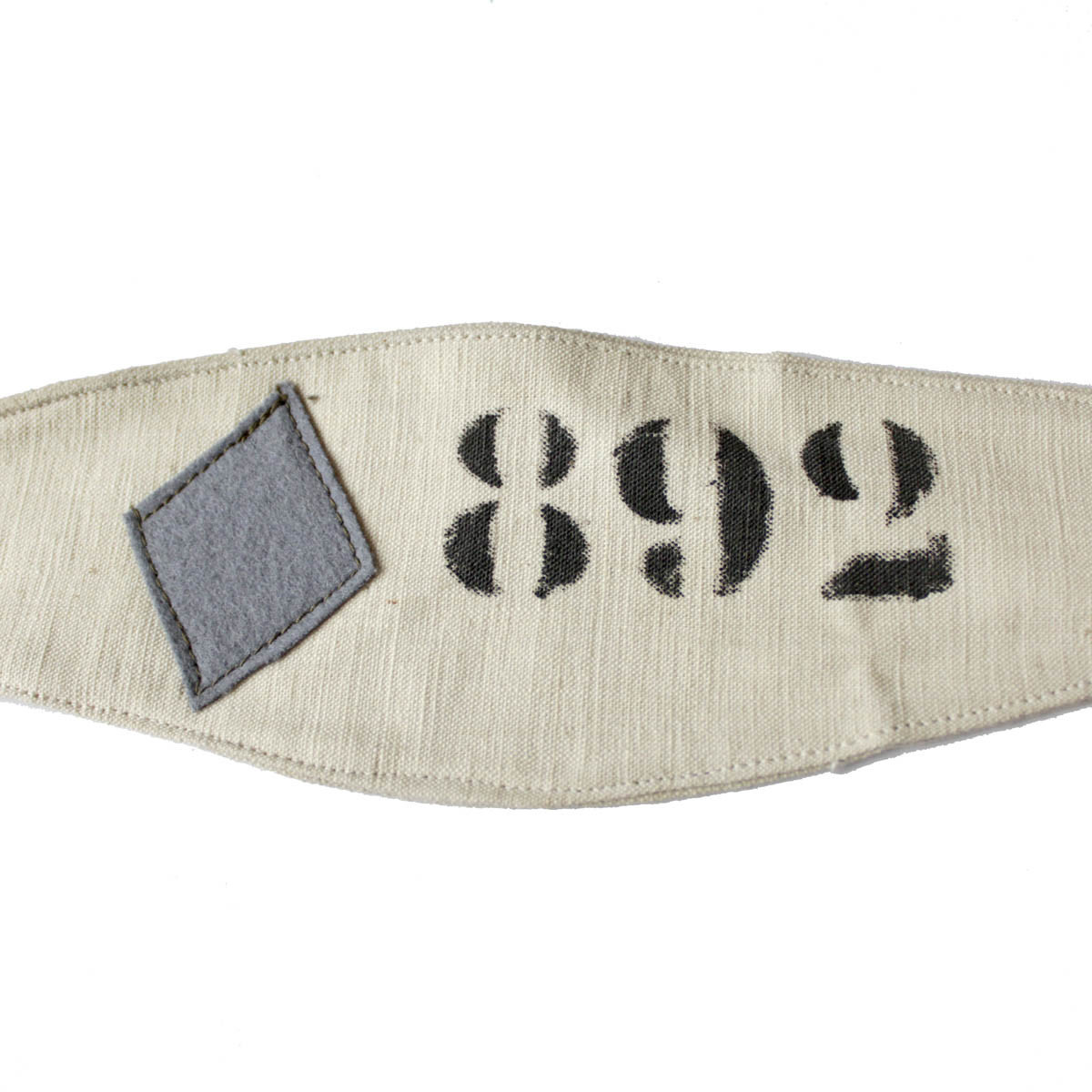 Couleur écru (plus ou moins foncé selon le tissu) avec losange de compagnie cousu et marquage 892.
