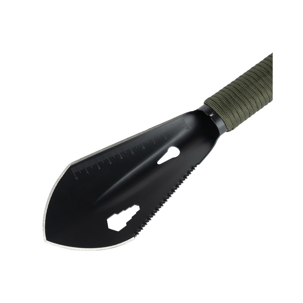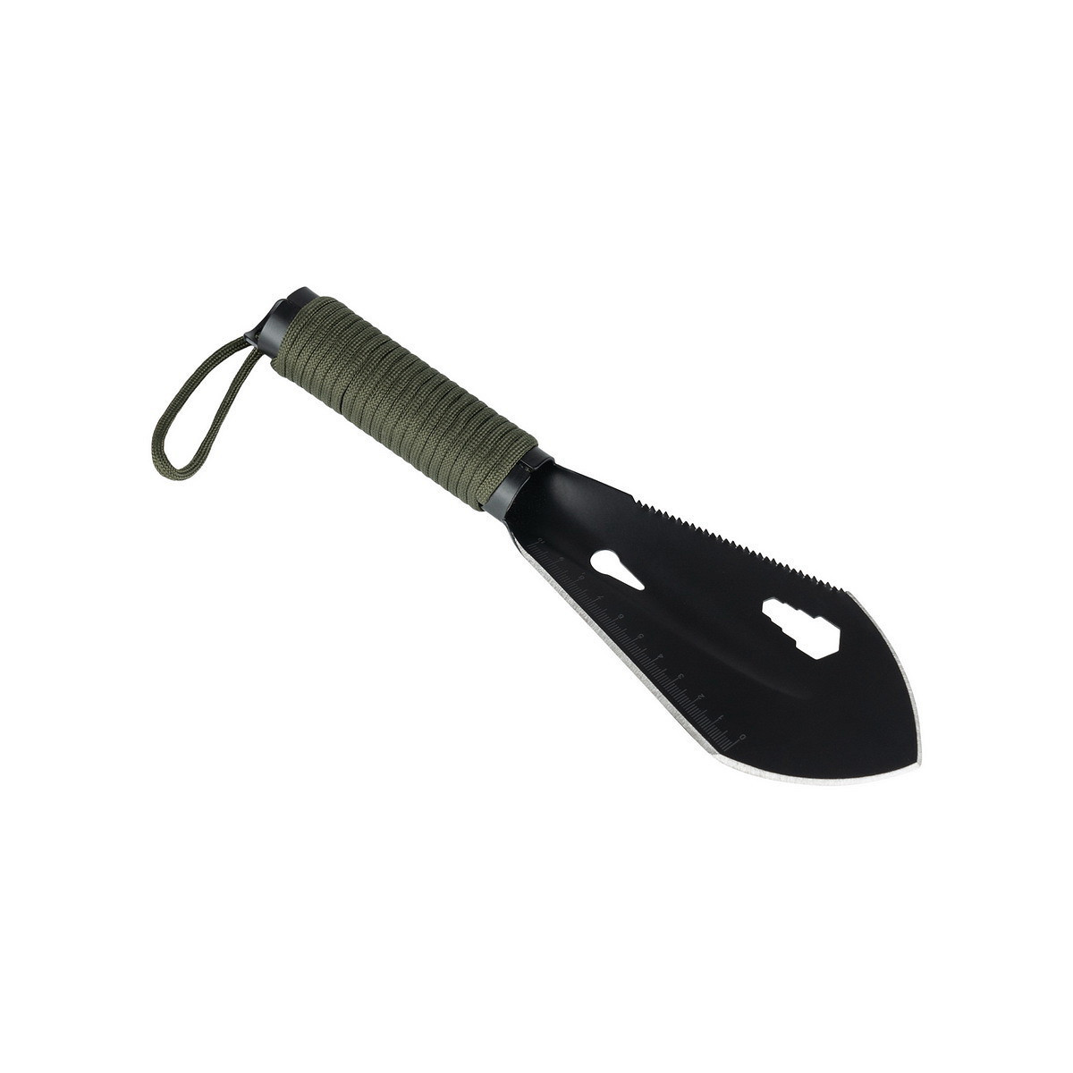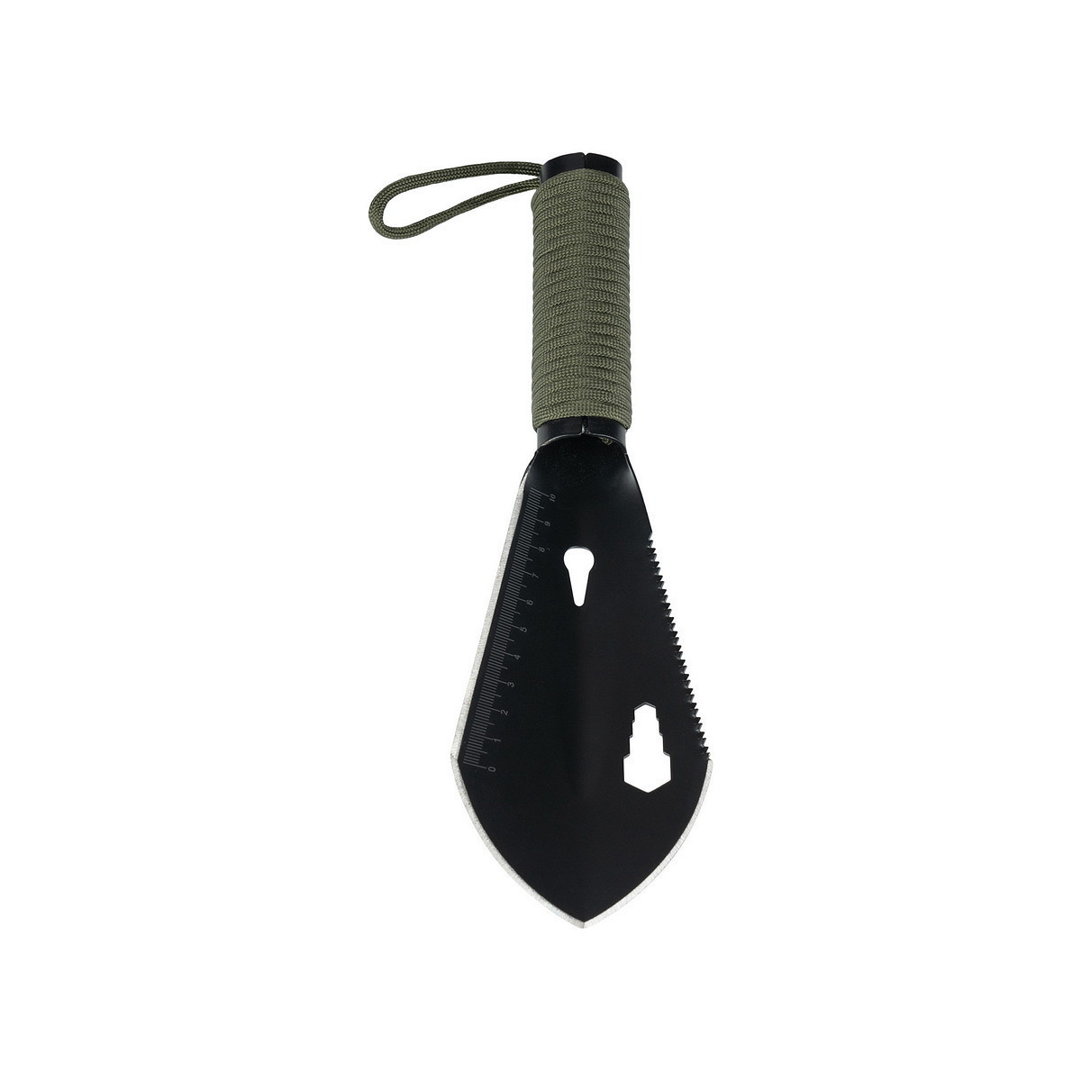 La pelle est fabriquée en acier inoxydable 420 de haute qualité. Une corde paracord de 2 mètres est attachée au manche, très utile en cas d’urgence.