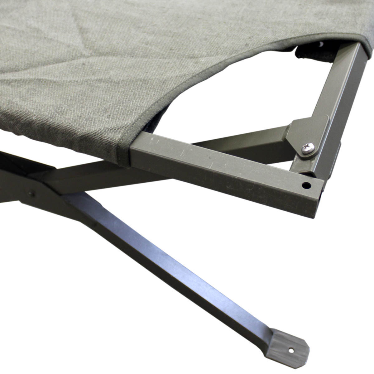 Cadre en acier peint vert armée. Toile en coton ajustable par corde et sangles. Les pieds peuvent être scellés au sol.